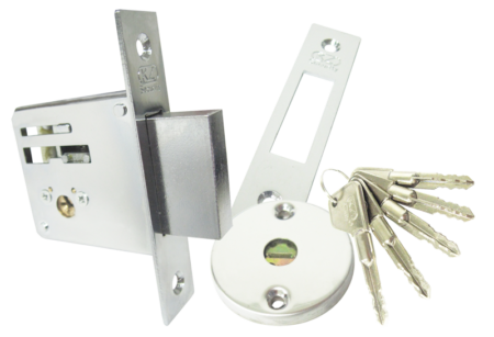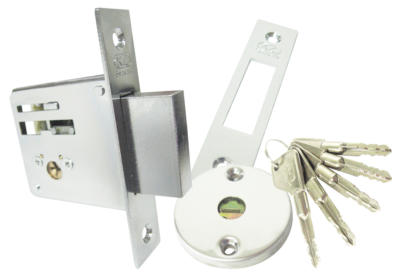 Cerradura de incrustar auxiliar de alta seguridad para puertas de madera o lámina. Escudo protector Anti-ganzua. Cerradura con sistema de seguridad tetra. Cinco llaves tetra. Pasador rectangular acerado.