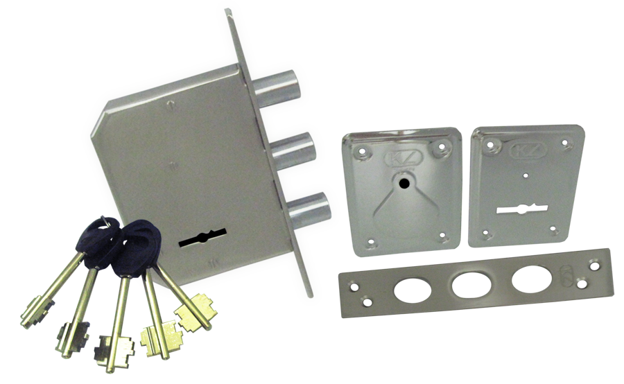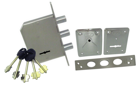 Cerradura de incrustar auxiliar de alta seguridad sistema San Pedro para puertas de madera o lámina. Escudo protector interno y externo. Distancia al centro 40 mm. Tres bulones en acero cromado. Cinco llaves San Pedro, cantonera y tornillos de instalación.